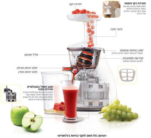 * מכיוון שהמיץ נסחט בשיטה האיטית הוא נשמר לאורך זמן רב יותר מהרגיל ונשאר טרי ( במקרר) אפילו ל 48 שעות